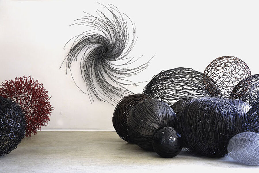 Wenn Angelika Summa ihre Skulpturen zusammenfügt, versteht man von außen erst einmal nichts. In meditativer Konzentration schichtet sie Element auf Element. Manchmal über Tage, manchmal über Monate hinweg. Immer dichter steigert sich das Geflecht aus Metallstäben, bis zur Undurchdringlichkeit. Sie arbeitet bevorzugt nachts, weil sie da nicht unterbrochen wird und am besten über den Prozess meditieren